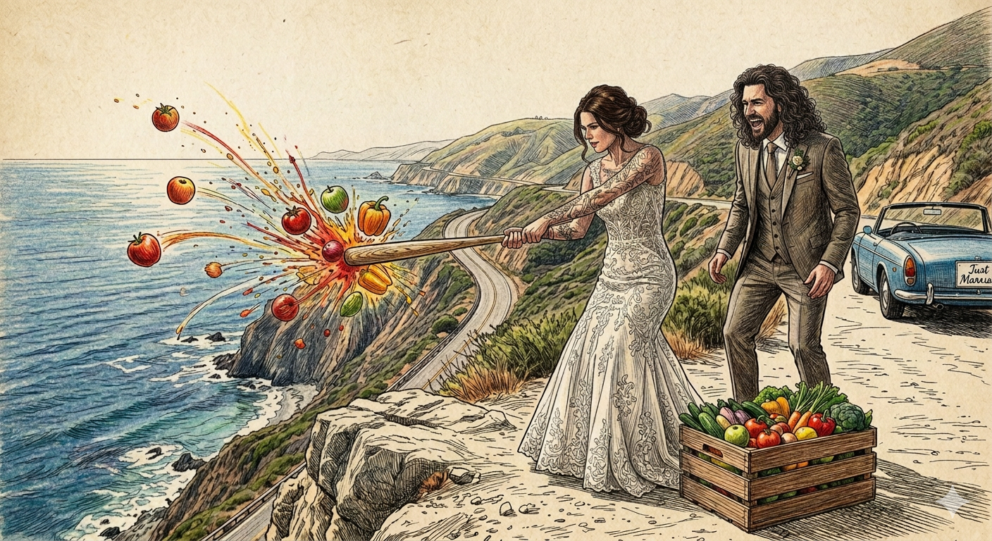 To her delight, he agreed. She drove him to a cliff overlooking the lake, handed him a baseball bat, and they spent the evening smashing eggs and produce into the abyss. As it turns out, there is truly nothing like the sound of flying tomatoes to bring two people together.